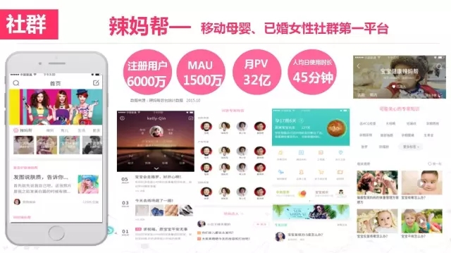 辣媽幫創(chuàng)立于2012年5月,僅用了4年時(shí)間,便擁有了6000萬(wàn)的用戶。辣媽幫致力于打造全新母嬰生態(tài)鏈,旗下四大應(yīng)用“孕期伴侶-辣媽幫-荷花親子-辣媽商城”涵蓋了女性“育兒-生活-情感-消費(fèi)”四大領(lǐng)域。