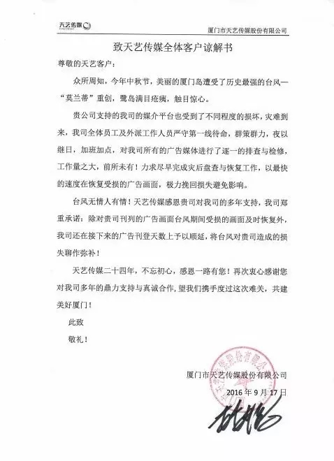 臺(tái)風(fēng)無情人有情!天藝傳媒感恩貴司對我司的多年支持,我司鄭重承諾:除對貴司刊列的廣告畫面臺(tái)風(fēng)期間受損的畫面及時(shí)恢復(fù)外,我司還在接下來的廣告刊登天數(shù)上予以順延,將臺(tái)風(fēng)對貴司造成的損失聊作彌補(bǔ)!